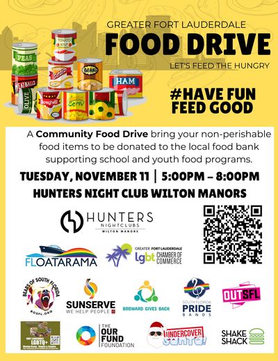 So come join all the supporting organizations and help #HaveFunFeedGood at Hunters Wilton Manors on Tuesday 11th November 5-8pm.